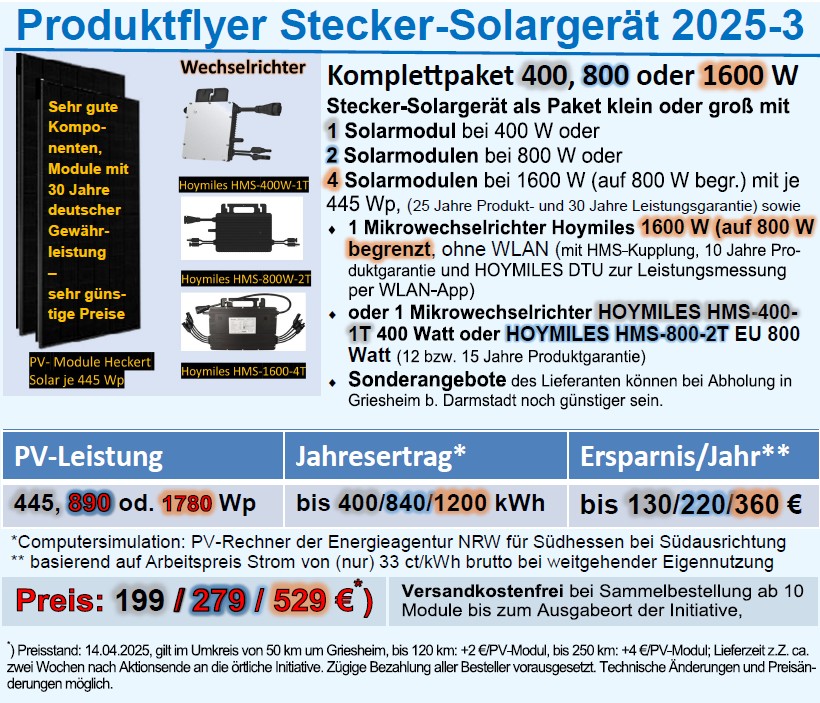 Die Energie Gemeinschaft Ried e.V. hat seit 2021 im Rahmen von 14 Aktionen zur Bestellung von Steckersolargeräten rund 800 Solarmodule kostenlos vermittelt und entsprechende Beratungen rund um das Thema Steckersolargerät unentgeltlich durchgeführt.